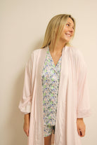 Soft, pretty, and made for pampering, this pink kimono robe adds a little sweetness to your stay-at-home routine. Perfect for slow mornings and cozy nights in.