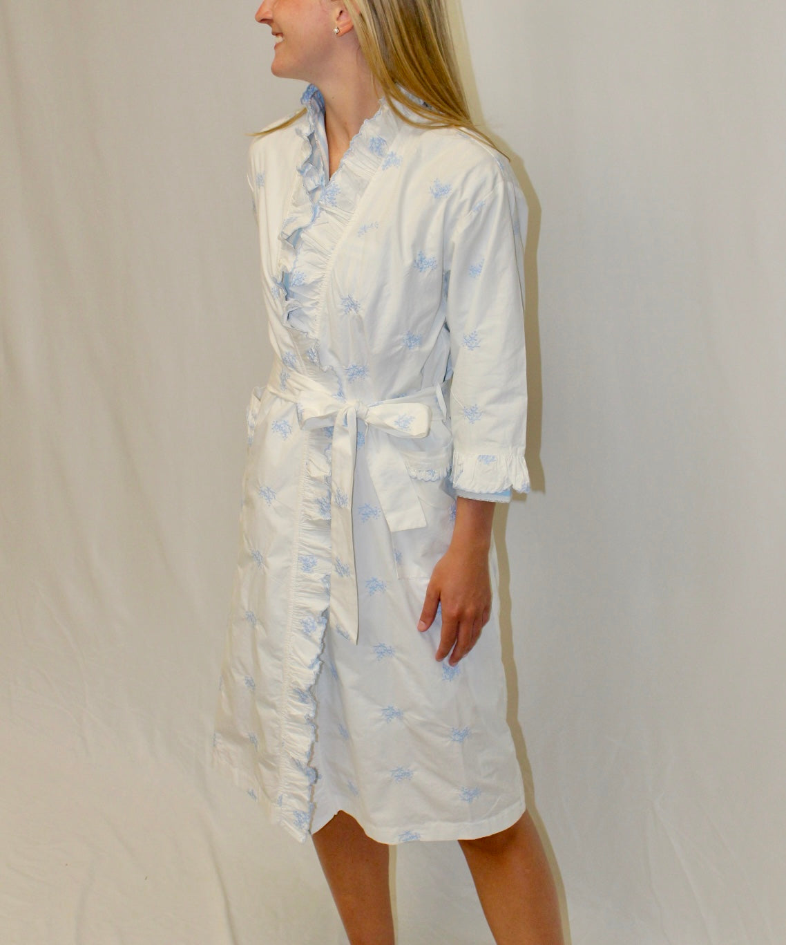 Nancy Cotton Ruffle Embroidered Robe - Blue