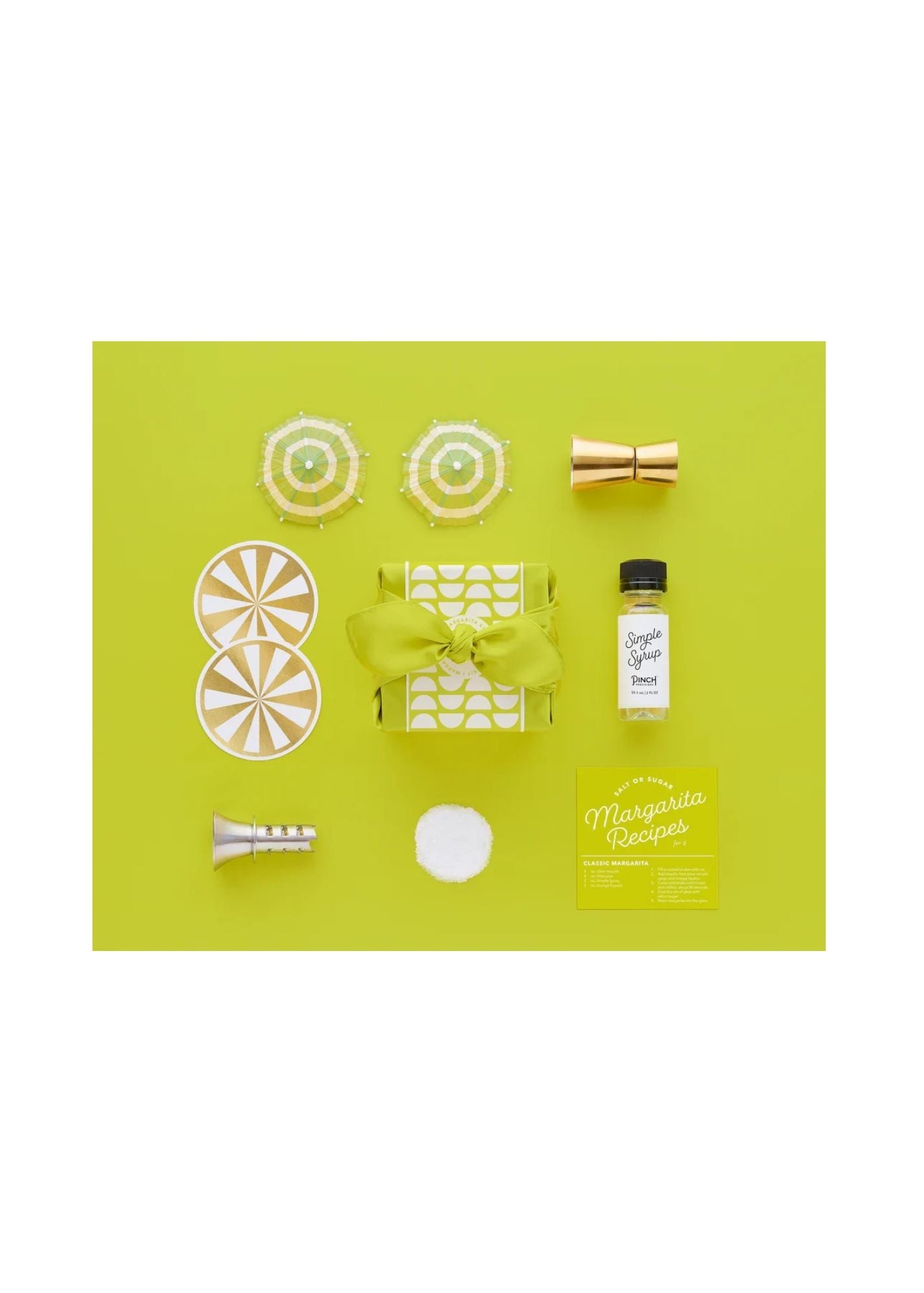 Perfect gift for Margarita LOVERS! Contains 11 must-haves: rimming salt, mini juicer, 4 drink umbrellas, 2 coasters and Margarita recipes.