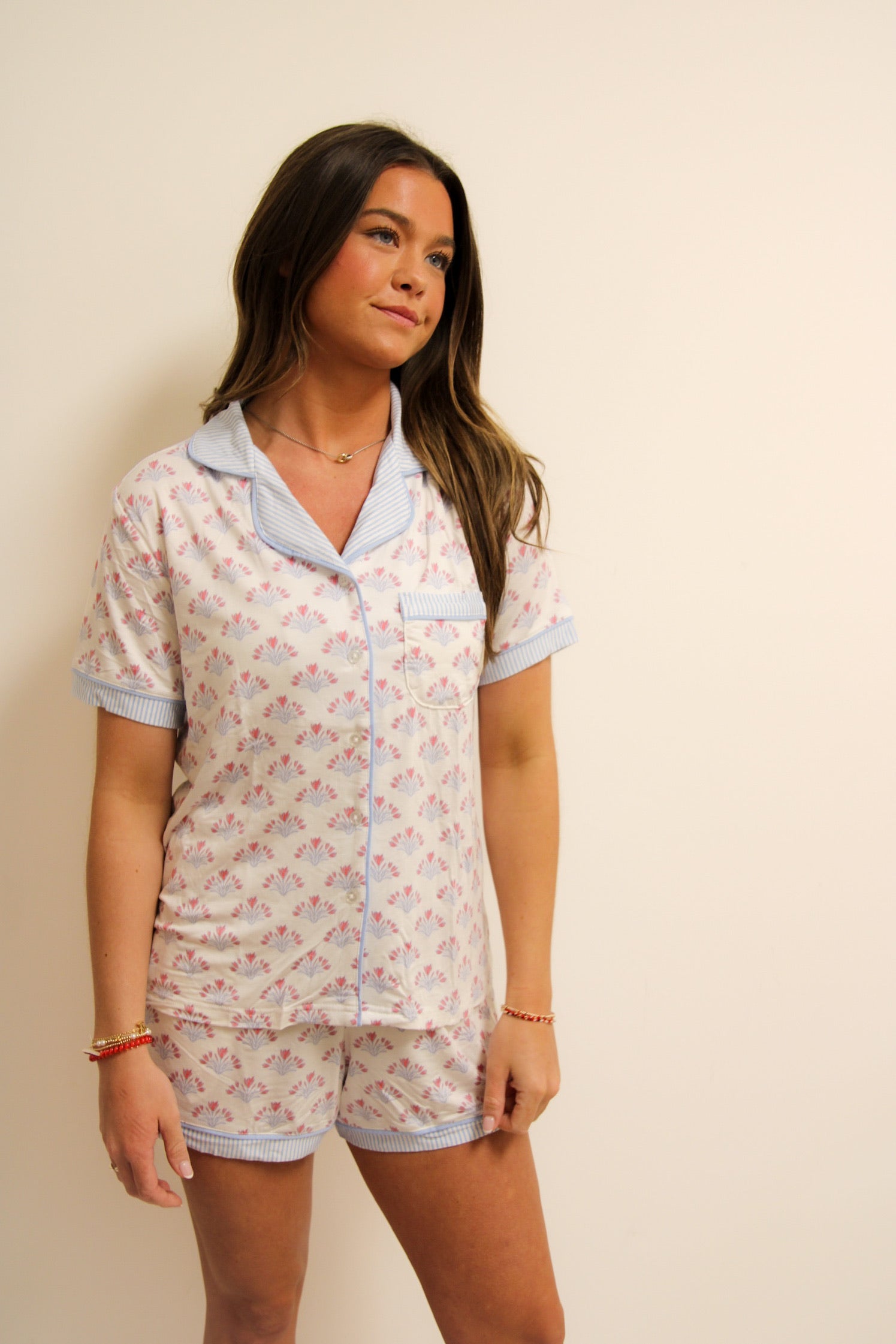 Enjoy the luxurious comfort of the Charlotte Shorts Set. This effortlessly elegant set includes a button-front top with a classic collar and adjustable drawstring shorts for a perfect fit.