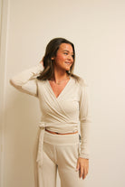 Effortlessly stylish and totally comfy, this oatmeal wrap top is perfect for lounging at home or running quick errands. A simple piece that instantly elevates your cozy look.