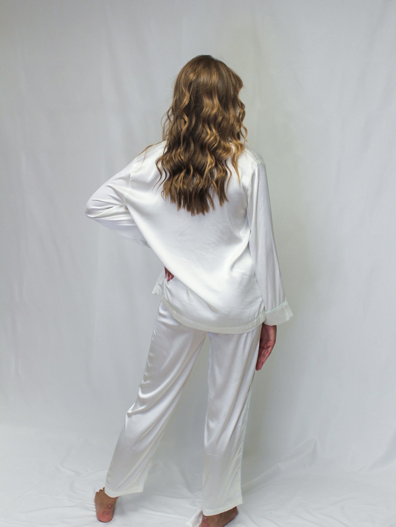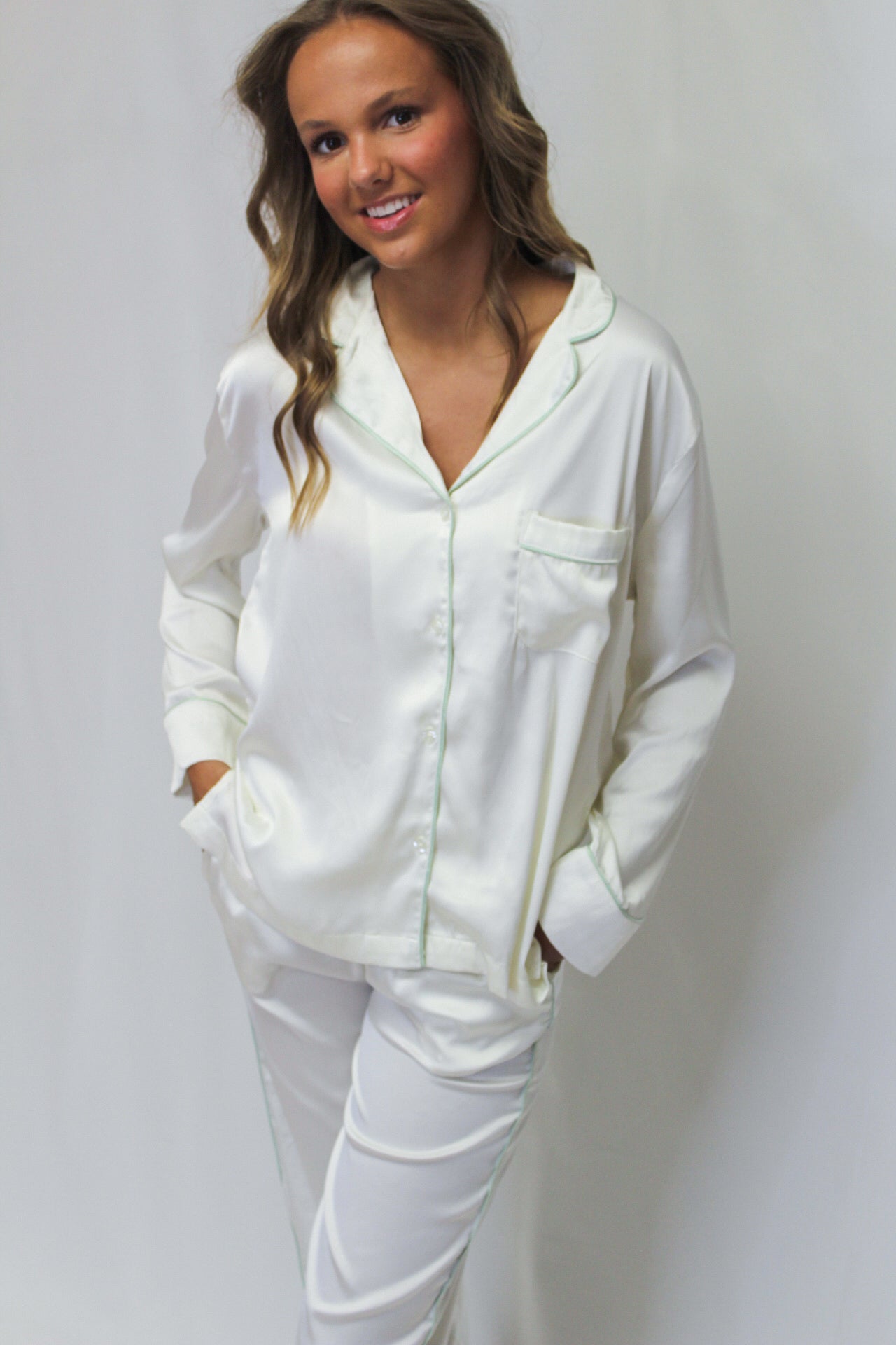 Birdie Satin Long Pajamas - Ivory/Seafoam